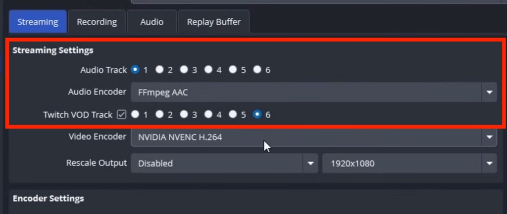 - Audio track → 1, Audio Encoder → FFmpeg AAC, Twitch VOD Track → 6 to add copyright-free music to streams.