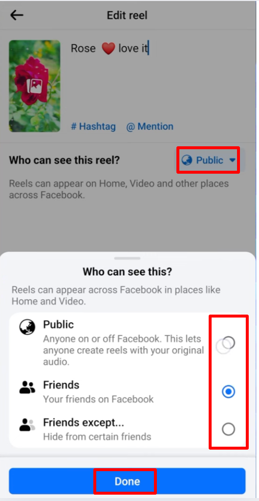 - Select who can view your Reel: Public, Friends, or Only Me.