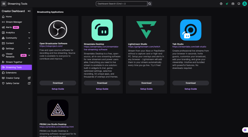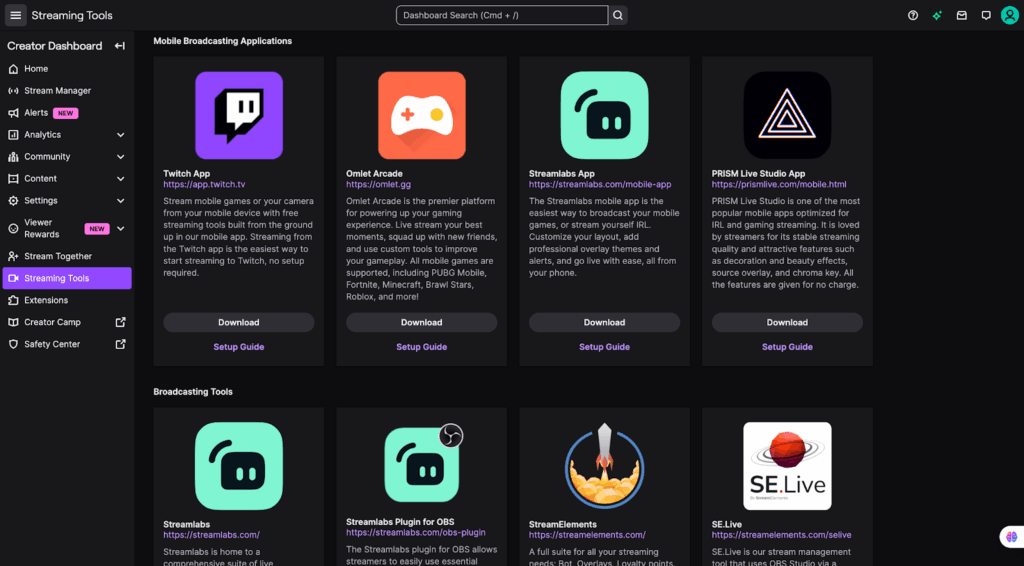 - Hosts/Co-Streamers: You will need broadcasting software or a streaming tool, as well as a supported web browser (e.g., Google Chrome). You can select any Streaming Tool, such as OBS, Streamlabs Desktop, XSplits, and many more available within your Creator Dashboard > Streaming Tools.