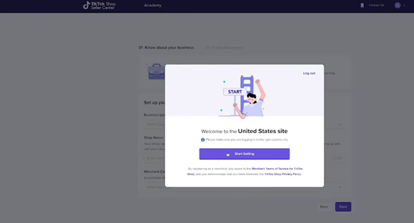 You first need to create an account on the TT shop before starting selling on the platform. So, visit the TikTok Seller Center and select your region first.