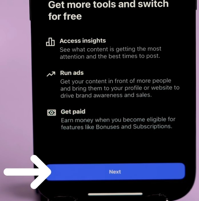 - Now, select “Creator” or “Business” account type, and click “Next.”