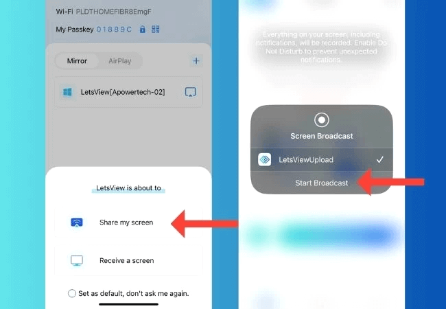 Step 4. Next, click “Share my screen” then “Start Broadcast.” This will initiate the process of sharing your iPhone screen with a PC.