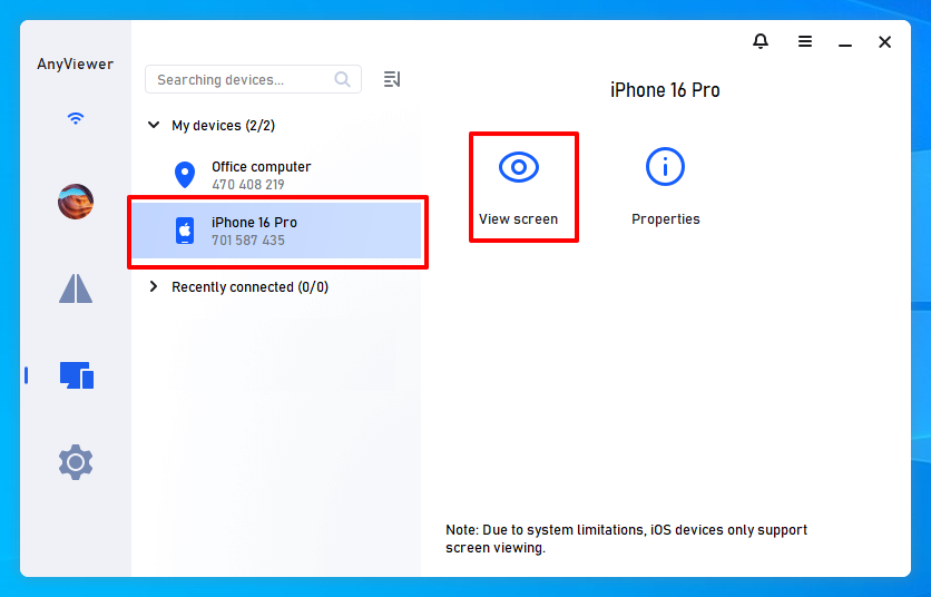 Step 3. From the AnyViewer interface on your PC, select your iPhone from the list of connected devices and choose “View Screen.”