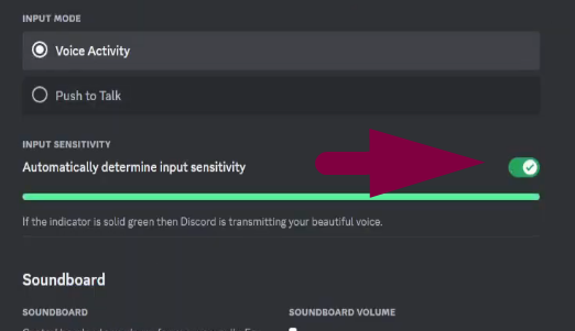 - In the Input Mode, choose “Voice Activity” and ensure the toggle is on for “Automatically determine input sensitivity.”