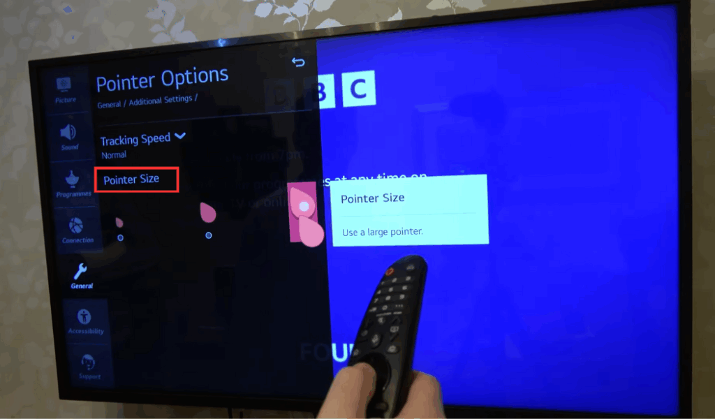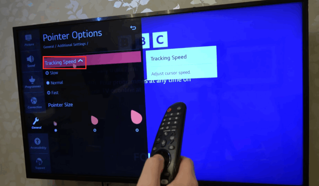 Tip: Move the remote to test the cursor. Pick the size and speed that feel best. If the pointer feels jumpy, switch tracking speed to slow. If it blocks on-screen text, try small.