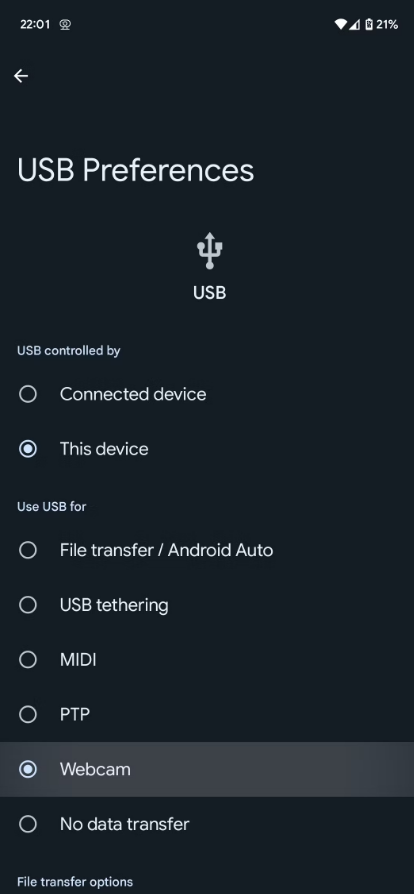 - When the USB connection prompt appears on your phone, choose the option labeled Webcam.