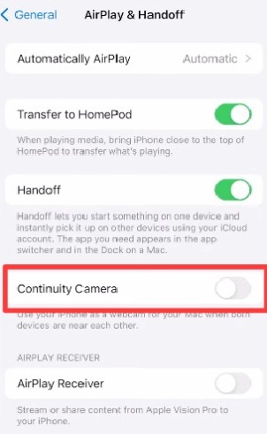 - Select “AirPlay & Handoff,” choose “Continuity Camera,” and turn it on.