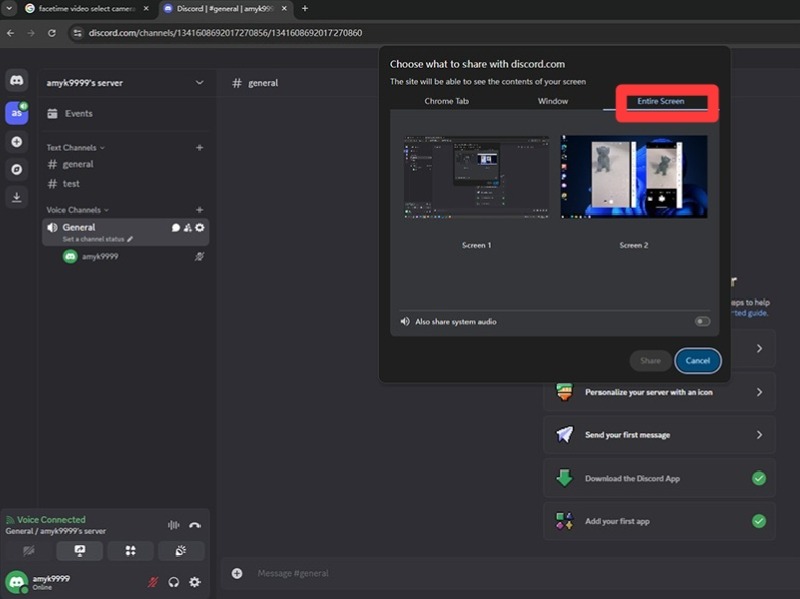 - If using the web version of Discord, select “Entire Screen” and then click “Share” to broadcast the mirrored phone screen.