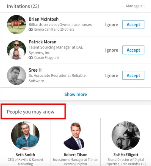 The ‘People You May Know’ feature offers suggestions grounded in commonalities between you and other members, incorporating contacts from your email and mobile address books.