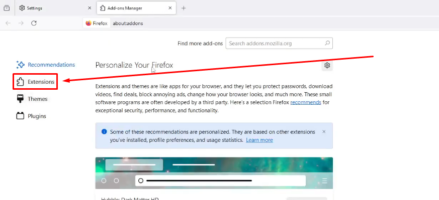 - Step 4: Doing so will direct you to the Add-ons Manager page (about: addons). So, click on the “Extensions” option below the Recommendations tab in the left panel to view the installed extensions