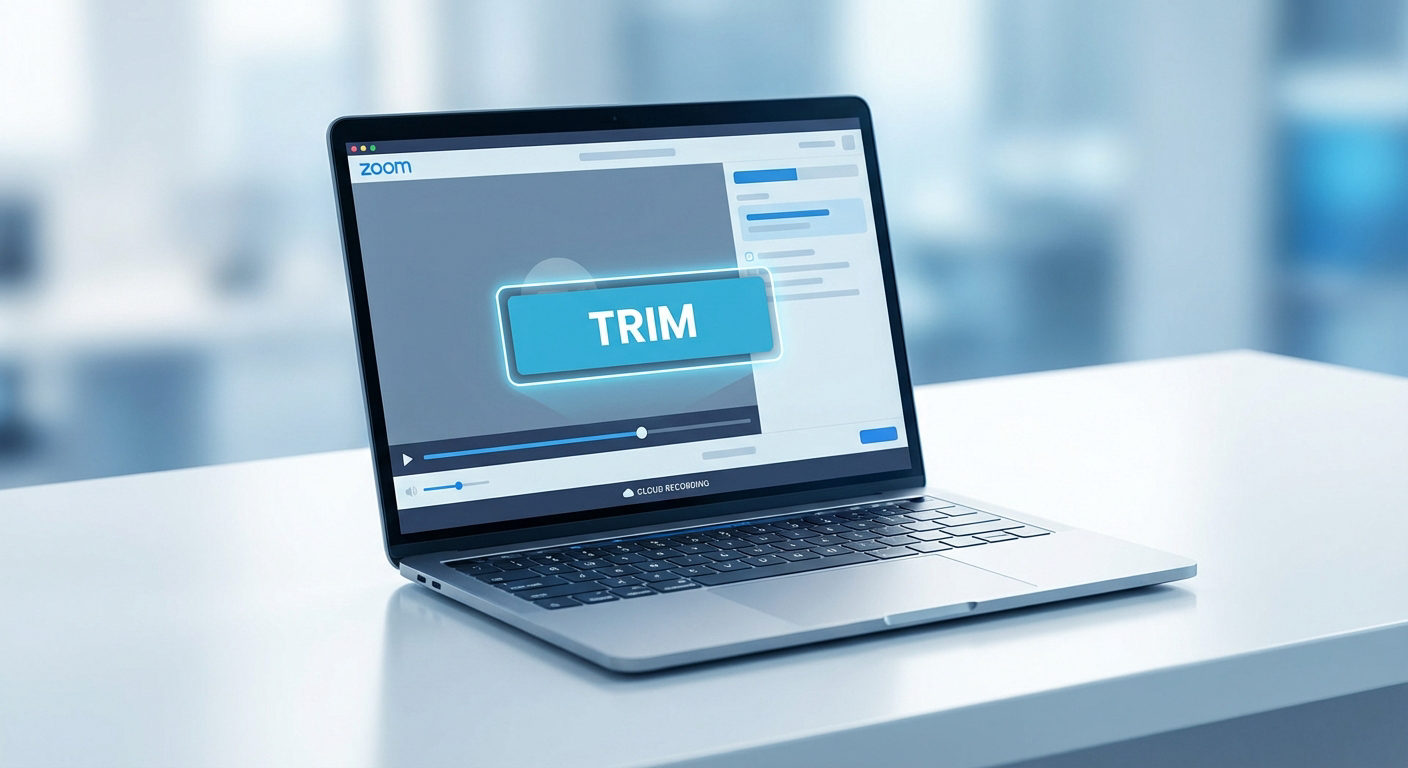 Zoom allows you to edit the recorded videos. Select the recording and choose the video-playing icon. Pause the playback and click on the scissor icon.