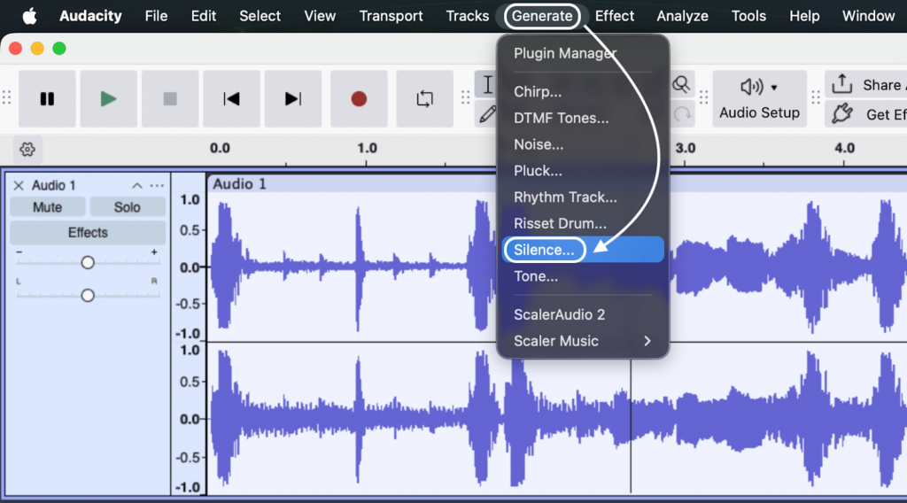 - Go to the top menu bar and select Generate > Silence.