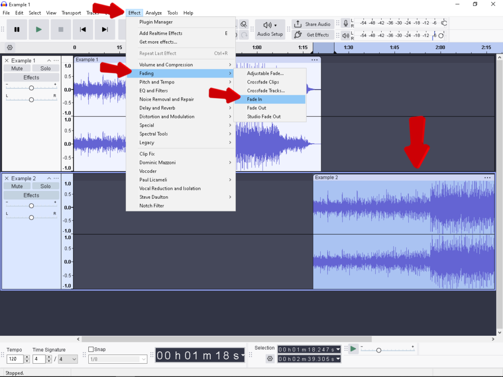 - Fade In: Highlight the first few seconds of your audio, then go to Effect > Fading > Fade In. This ramps the volume up from silence.