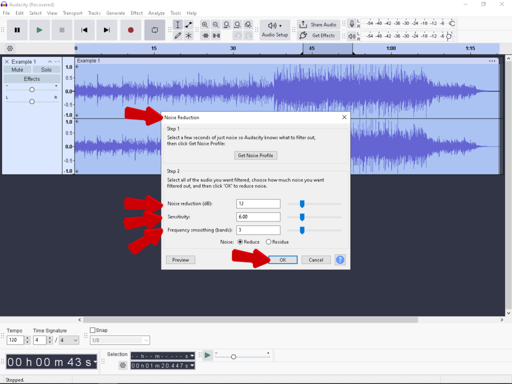 - Noise Reduction (dB): This controls how much volume is removed from the detected noise. A setting of 6 to 12 dB is usually sufficient for mild hiss.
