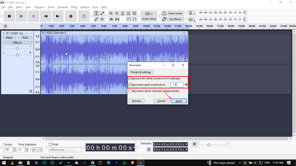 Note: You might see your waveform shrink (peaks get lower) after doing this. Don’t panic. This means your average volume now matches professional standards.