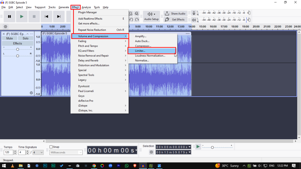 1. Use a Limiter: Go to Effect > Volume and Compression > Limiter Set it to “Threshold” and choose a limit (e.g., -3.0 dB). This will “shave off” the loudest spikes.