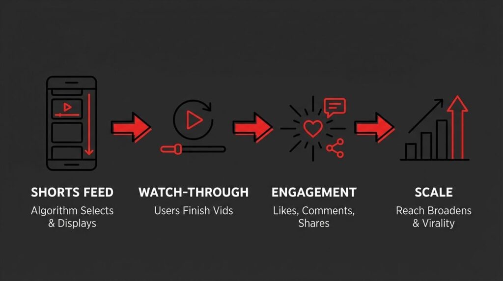 Shorts are distributed primarily through the Shorts shelf on the YouTube homepage, the Shorts tab on mobile, and the Shorts feed — a swipeable vertical format similar to TikTok. Unlike long-form videos, which are recommended based on watch history and click-through rate accumulated over days or weeks, Shorts are pushed into discovery feeds quickly and assessed almost entirely on early momentum.