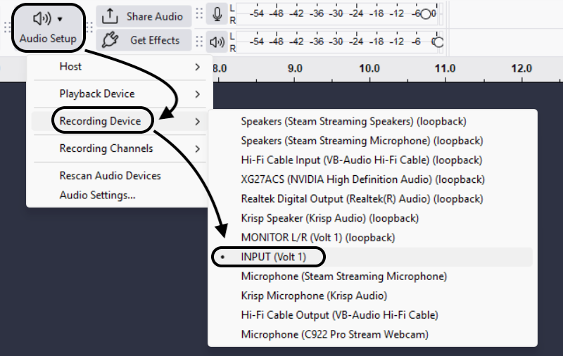 Follow this exact sequence to ensure Audacity recognizes your instrument.