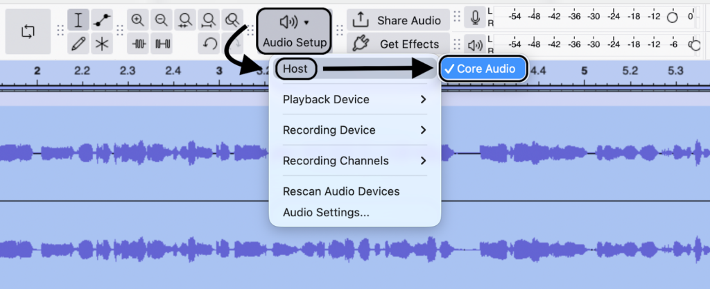- Enable Overdub: Go to Transport > Transport Options and ensure “Enable audible input monitoring” is on so you can hear the track.