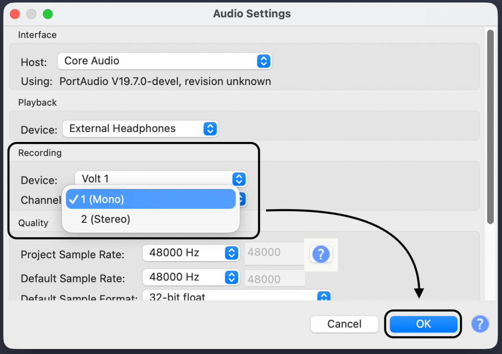 - Go to Audio Setup > Audio Settings > Recording > Channels and select 1 (Mono) Recording Channel.