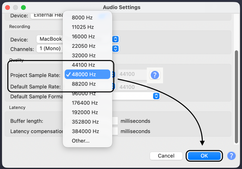 - Set this to 44100 Hz (CD quality) or 48000 Hz (Video standard). Ensure this matches the sample rate setting on your interface or the LARK MAX 2 to prevent synchronization errors.