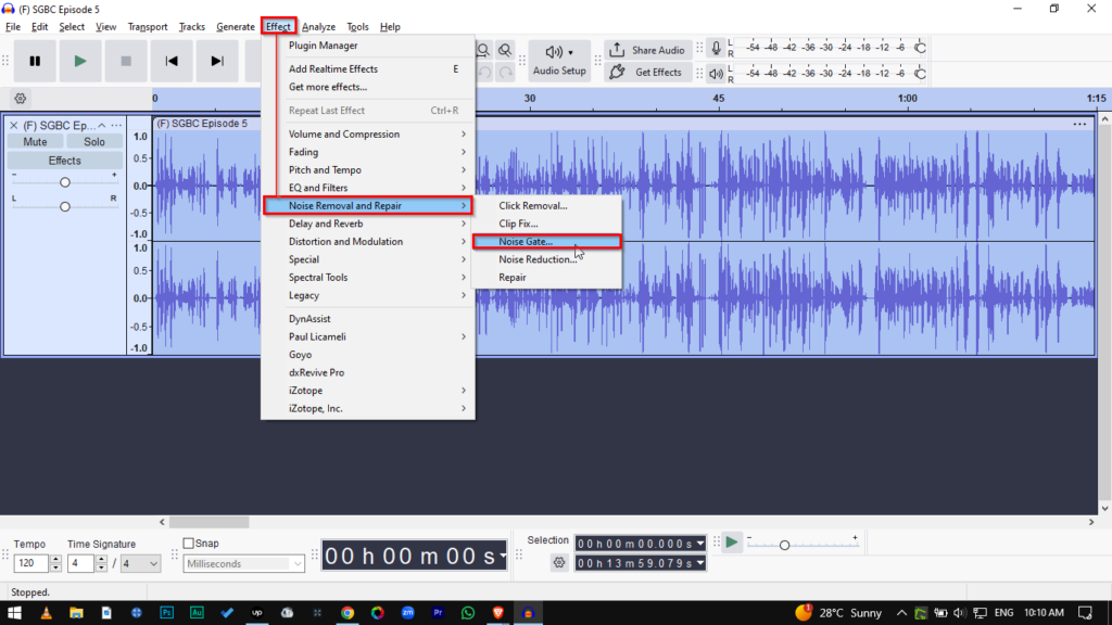- Open the Plugin: Go to Effect > Noise Removal and Repair > Noise Gate.