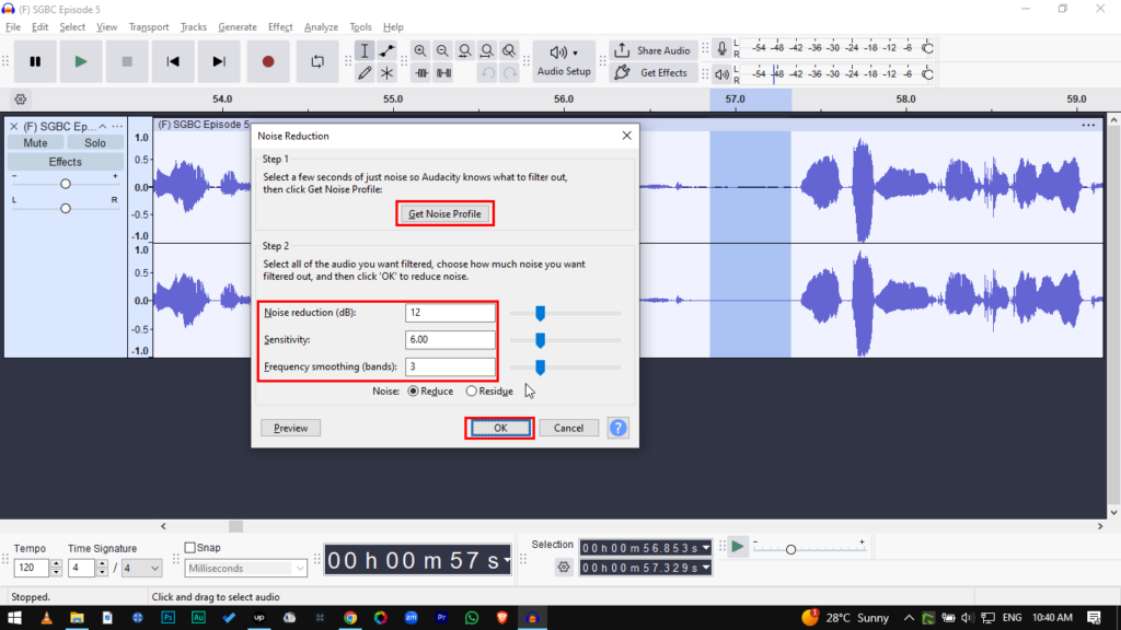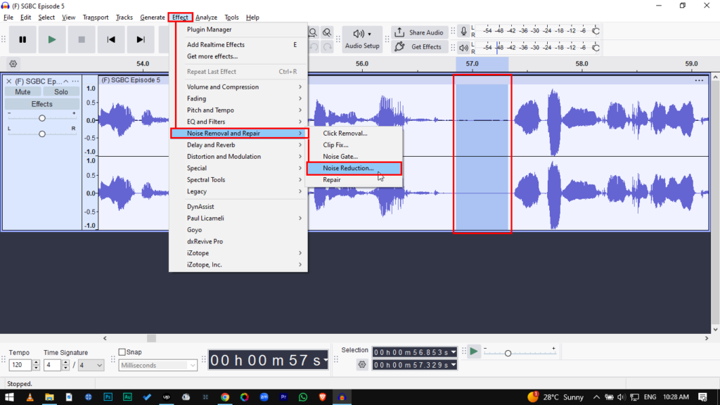 - Apply the Effect: Select your entire track (Ctrl+A / Cmd+A). Go back to Effect >Noise Removal and Repair > Noise Reduction.