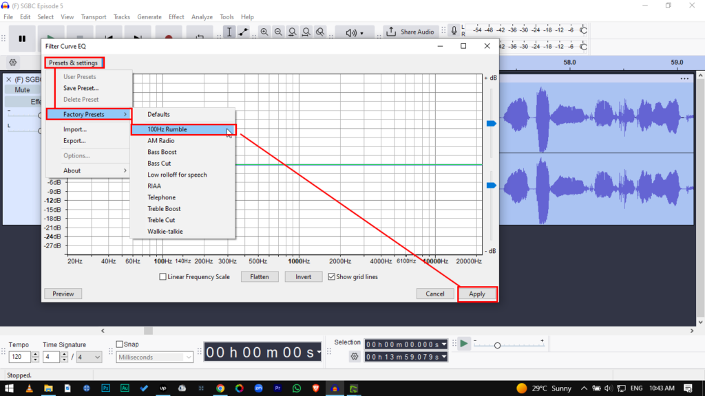 - Alternatively, use a preset: Click Presets & Settings > Factory Presets > 100Hz Rumble.