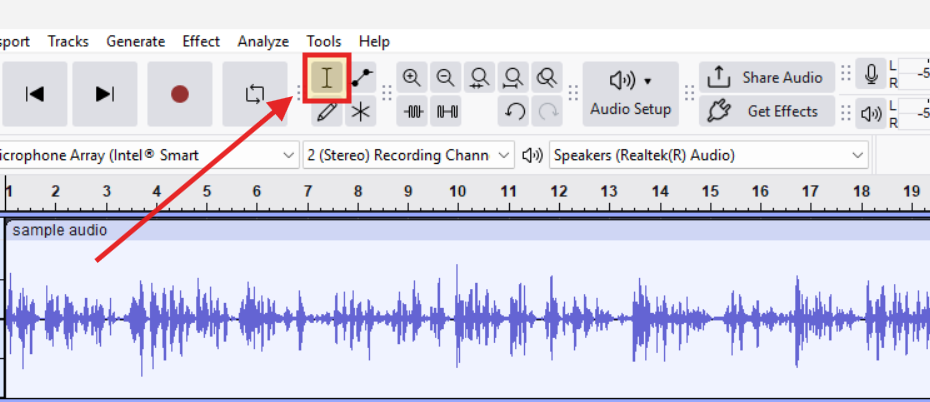 1. Select the Audio: Using the Selection Tool (I-beam icon), click and drag to highlight the specific section of the waveform you want to isolate.