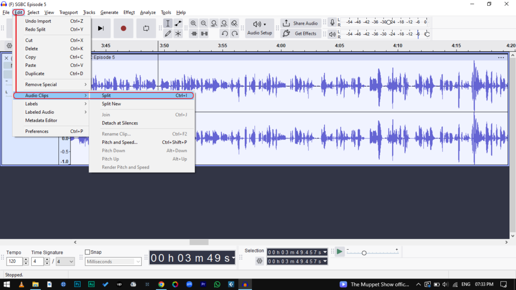 - Press Ctrl + I (Windows) or Cmd + I (Mac). You can also go to Edit > Audio Clips > Split.