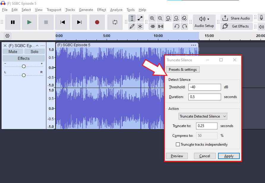 - Apply: Click OK. Audacity will scan the track and shorten any silence that exceeds your limit.