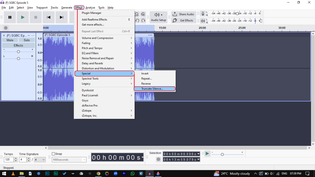 - Open the Effect: Go to Effect > Special > Truncate Silence.