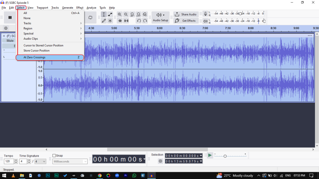 - Press Z on your keyboard (or go to Select > At Zero Crossings).