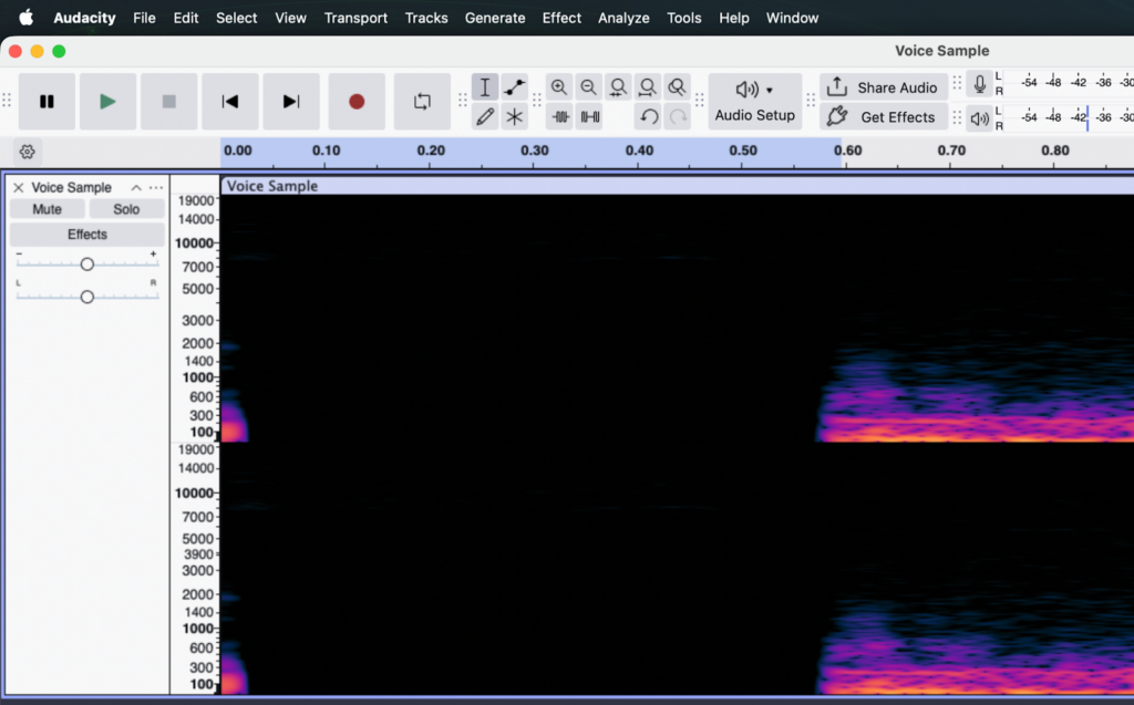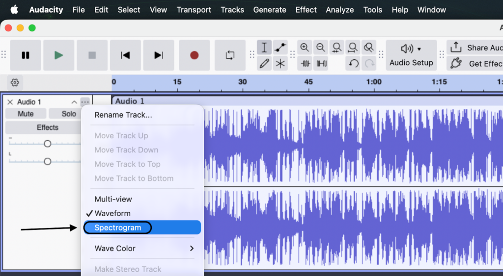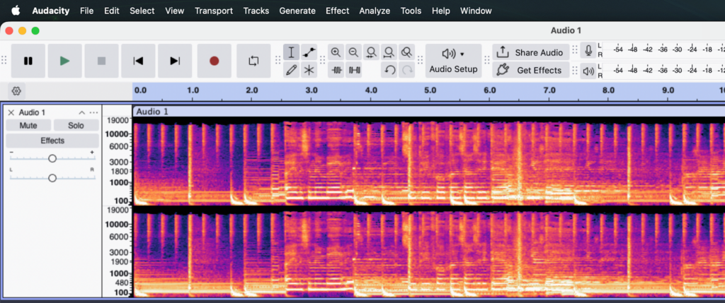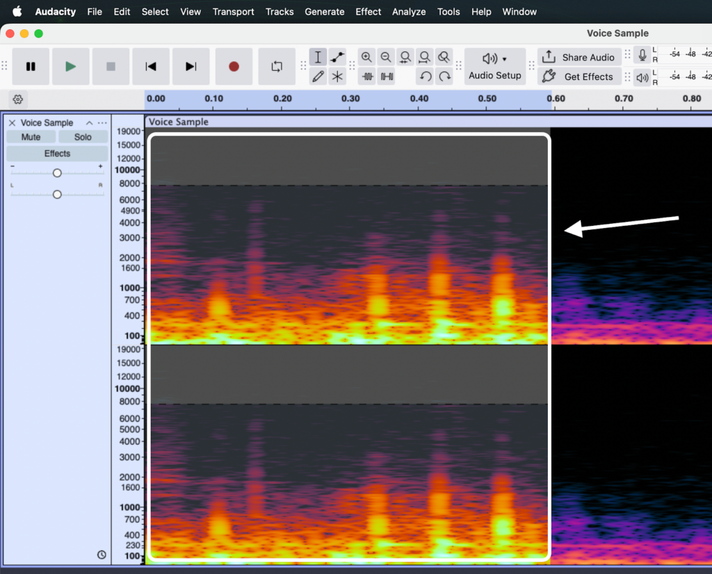 By default, Audacity displays audio as a blue waveform. To access the spectral data: