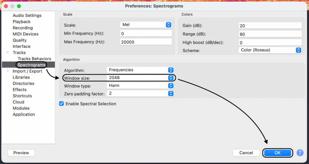 If your spectrogram looks like a fuzzy blur rather than distinct lines, your Window Size is likely set too low. Go to Edit > Preferences > Spectrograms and increase the Window Size to 1024 or 2048. This sharpens the frequency visibility, making it easier to see horizontal pitch lines.