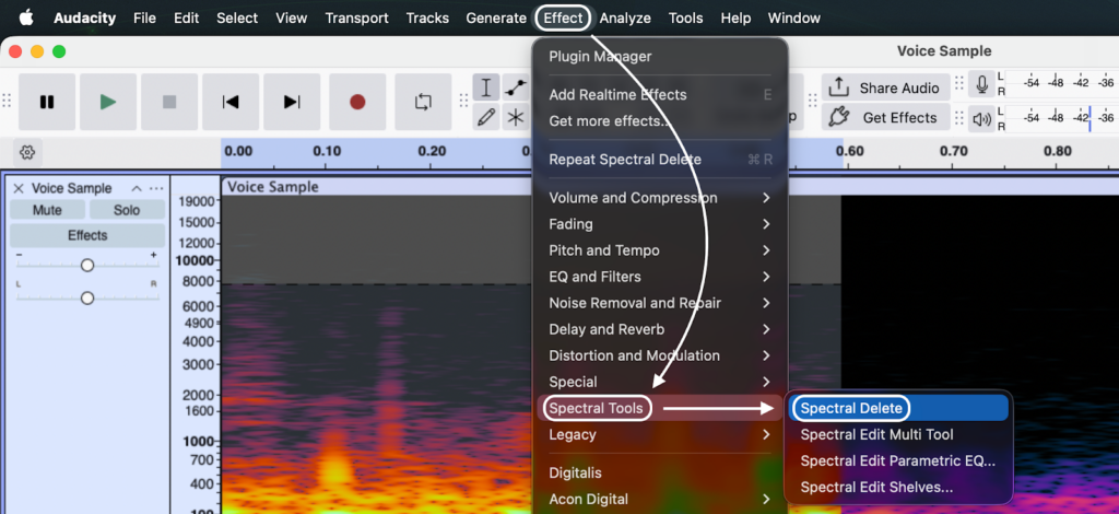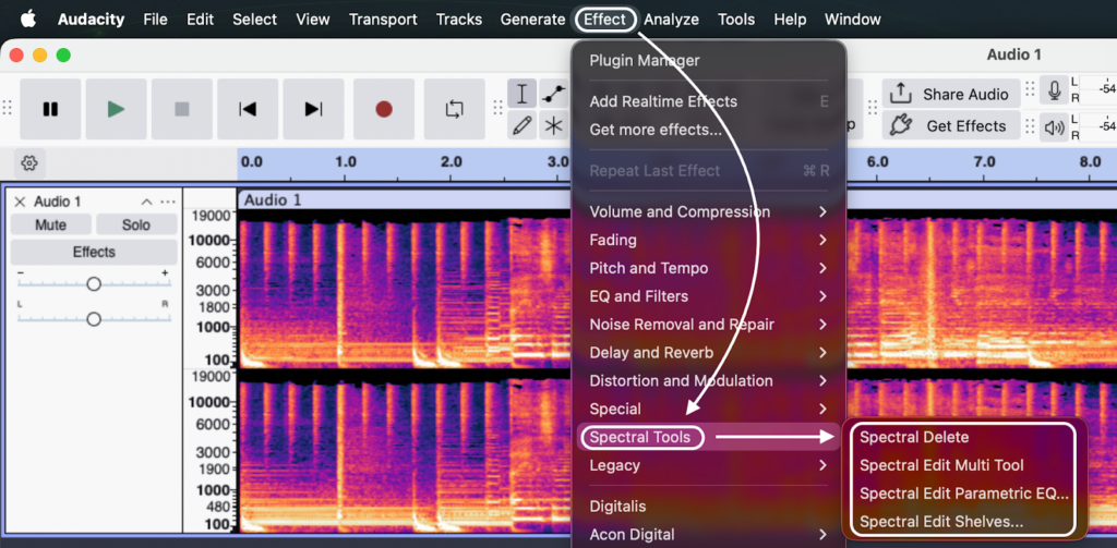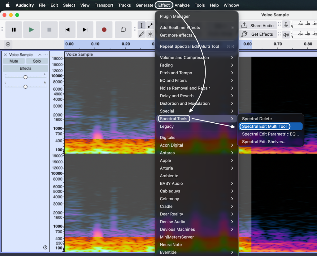 - Spectral Effects (Multi-Tool & Delete): These are located in the main menu under Effect > Spectral Tools. You must make a selection using the Spectral Selection Tool first before these effects become active.