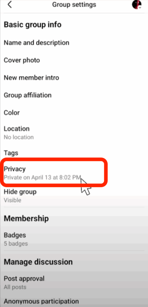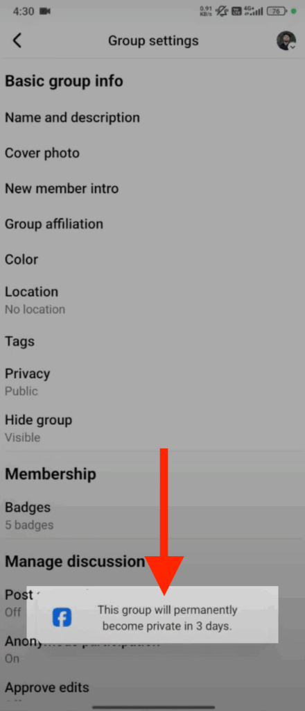 - Klicken Sie nun auf die Option Privatsphäre. Sie sehen die Frist für die Änderung, die 3 Tage ab dem Tag beträgt, an dem die Gruppe privat gemacht wurde.