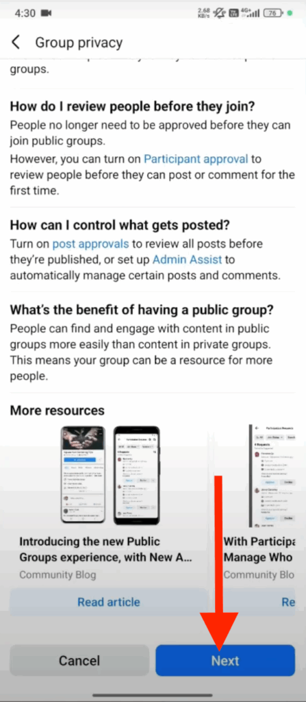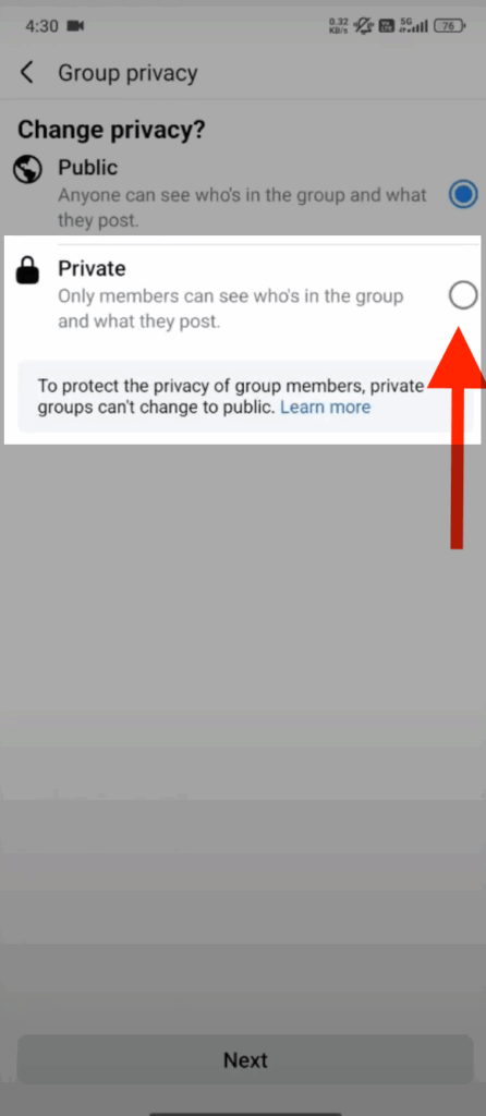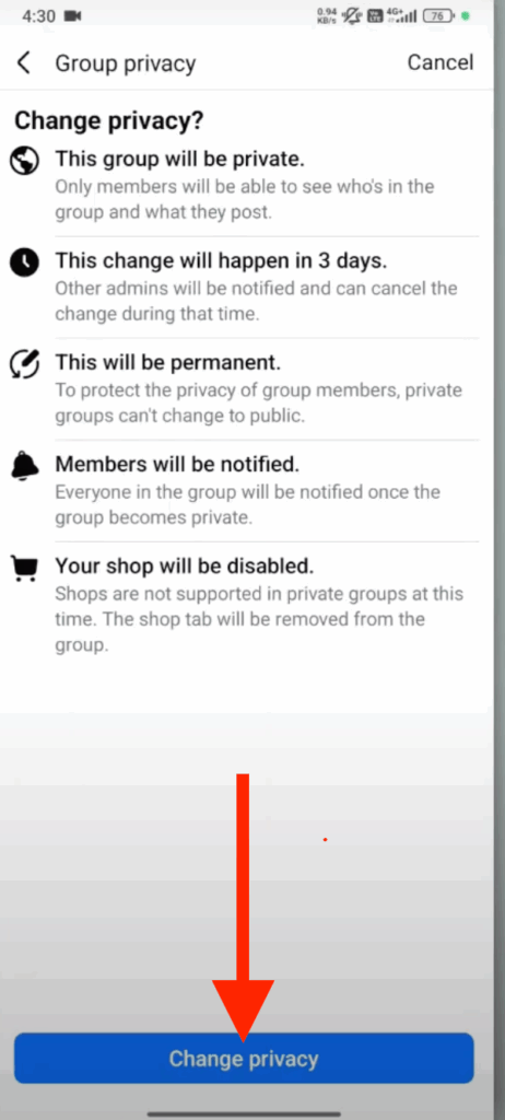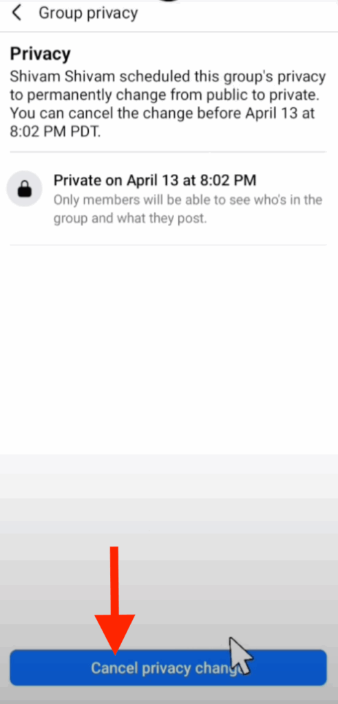 - Klicken Sie auf die Schaltfläche Privatsphäreänderung abbrechen, und Ihr Gruppenstatus wird öffentlich.