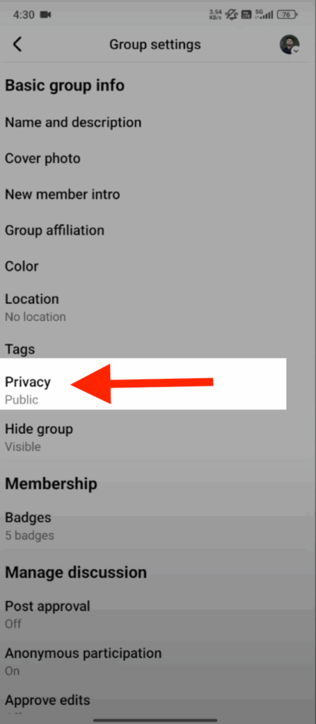 Schritt 7: Wählen Sie nun die Option „Privatsphäre“ unter dem Menü „Grundlegende Gruppeninfo“.