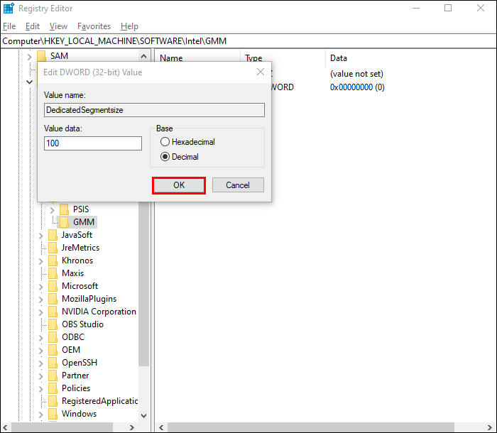 - Ouvrez “DedicatedSegmentSize,”, sélectionnez “Décimal,” et tapez une valeur entre 0 et 512.