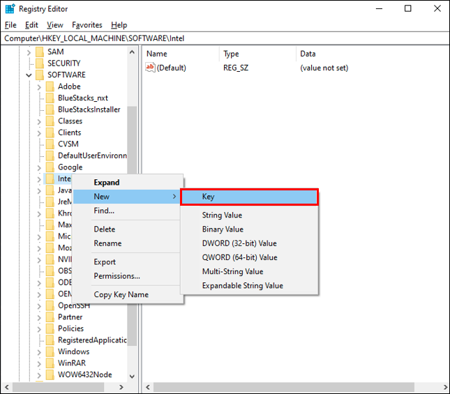 - Cliquez avec le bouton droit sur “Intel” dans la barre latérale et sélectionnez “Nouveau -> Clé.”