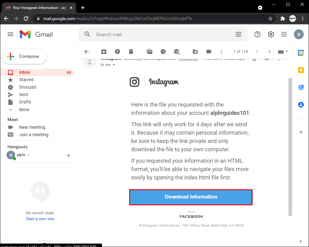 - Une fois que vous avez reçu un e-mail officiel d’Instagram, cliquez sur “Télécharger les informations.”