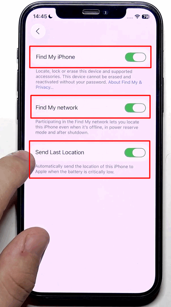 「iPhoneを探す」、「探すネットワーク」、「最後の位置情報を送信」の3つすべてがオンになっていることを確認してください。オンになっていない場合は、オンにしてください。これら3つのオプションはすべて主にiPhoneの位置を特定するのに役立ち、特に「探すネットワーク」オプションは、オフラインまたは電源がオフの場合でも見つけることができます。