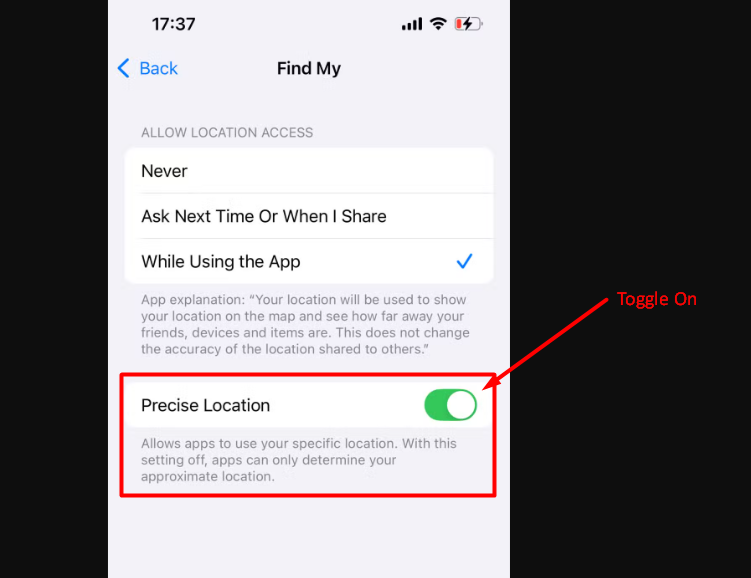 明らかに、iPhoneは位置情報サービスが携帯電話で有効になっている場合にのみ、リアルタイムの更新を提供します。そのため、デバイスで位置情報がオフになっている場合、電話はあなたの居場所を更新できません。1時間前、5分前などのタイムスタンプ付きの最後に確認された位置のみが提供されます。位置情報サービスが有効になっているにもかかわらず、まだ問題が発生している場合もあります。これは通常、デバイスを再起動してサービスを再有効化するだけで簡単に対処できる一時的なバグが原因です。