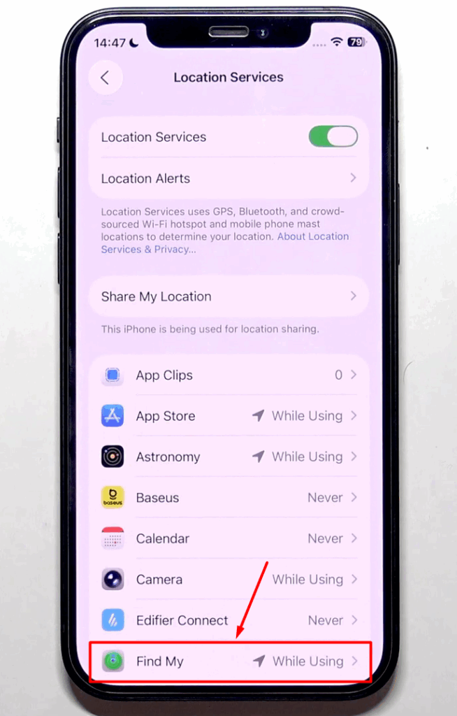 例えば、「iPhoneを探す」アプリがインストールされているとします。プライバシー設定でアプリが位置情報にアクセスしないように設定されている場合、位置を追跡することができません。この方法では、アプリがリアルタイムの位置情報更新を追跡することが許可されている場合の最後に確認された位置のみを受信します。